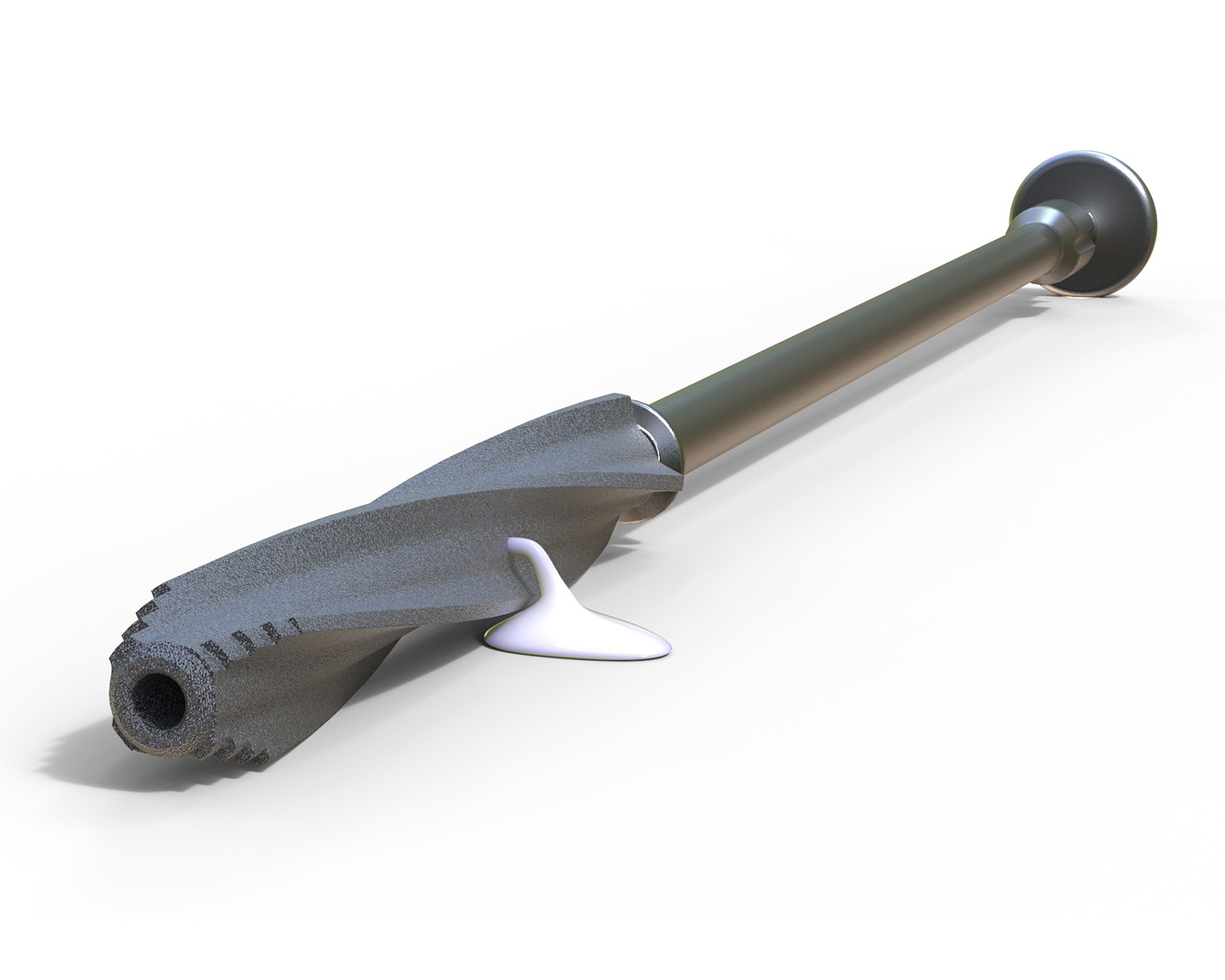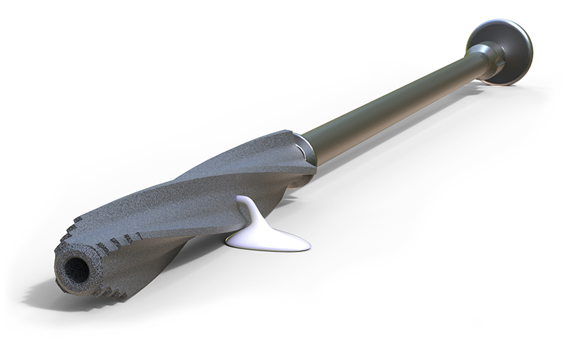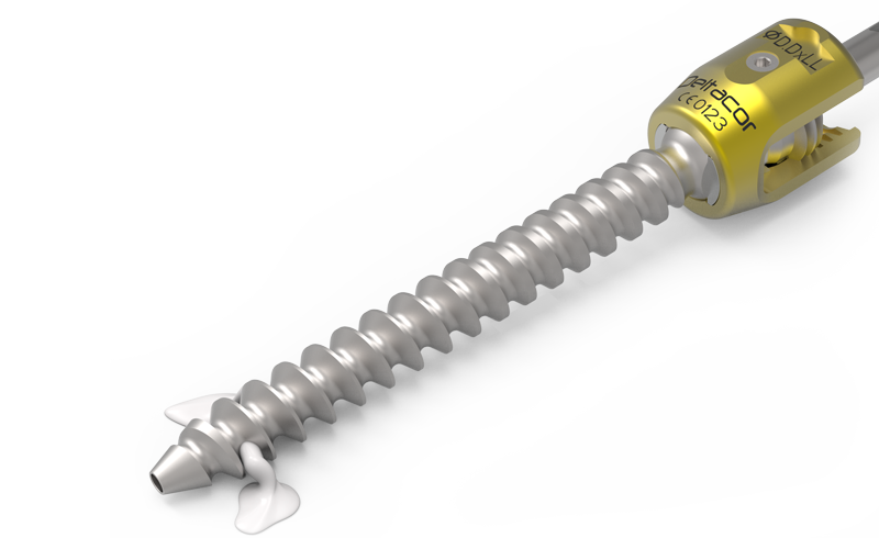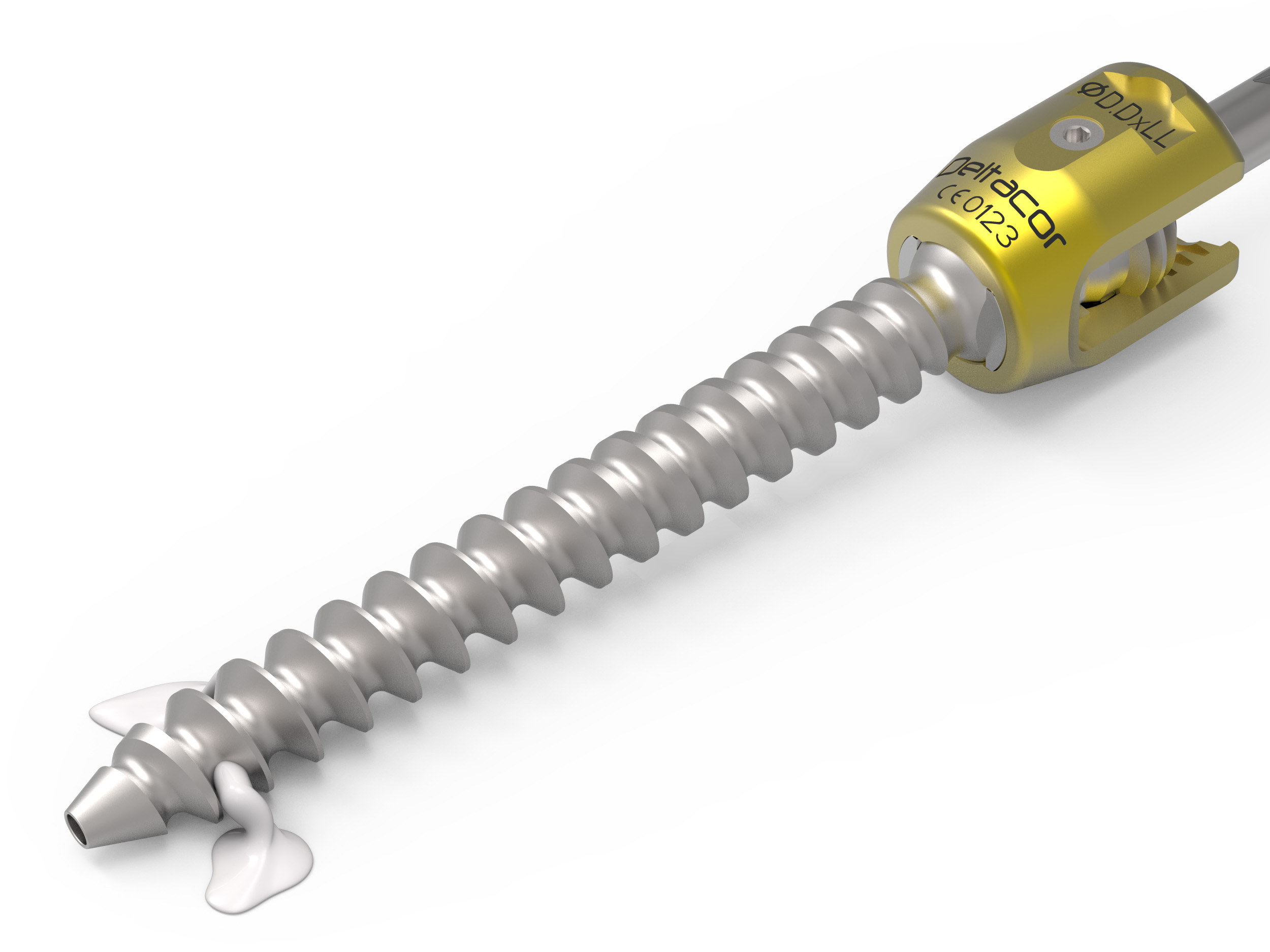 Torpedo erlaubt bei Frakturen des Saktrums durch seine Fenesteriung im conical-spiral-turn eine feste Verankerung des Implantates mittels Zementinjektion. Der Zement wird durch eine steuerbare Applikationshülse durch die Kanülierung des Implantates eingebracht. Dabei kann jede Austrittsöffnung gezielt angesteuert werden und somit dezidiert in die entsprechenden Voids injiziert werden.